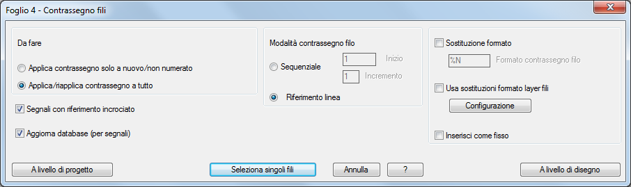 Le impostazioni delle proprietà del disegno sono preselezionate, ma è possibile sostituirle. I numeri di fili contrassegnati come "fissi" non vengono aggiornati quando si utilizza il comando Numeri fili. Utilizzare il comando Modifica numero filo per contrassegnare un numero di filo come "fisso". Trova