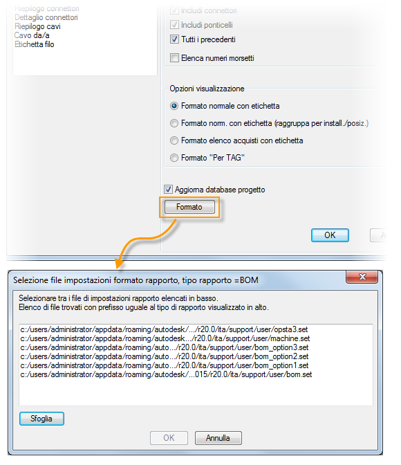 Ciascun file di formato viene salvato con estensione .SET. Per utilizzare un file di formato quando si esegue un rapporto, selezionare il pulsante Formato nella finestra di dialogo Rapporto, quindi selezionare il file .SET.
