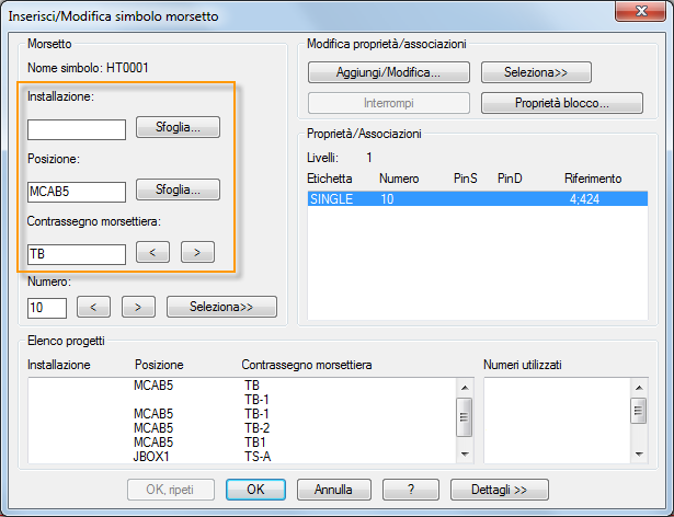 È possibile visualizzare e modificare le proprietà di un morsetto nella finestra di dialogo Inserisci/Modifica simbolo morsetto. Trova