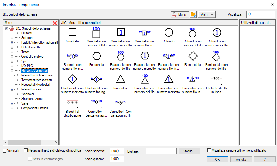 È possibile inserire i morsetti come gli altri simboli dello schema dal browser del catalogo o dal menu icone. Quando si inseriscono i morsetti dal browser del catalogo, selezionare la categoria TRMS (Morsetti).
