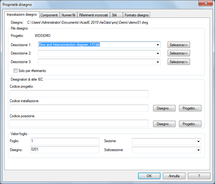 Le proprietà del disegno controllano molte delle funzioni di Set di strumenti AutoCAD Electrical. Essi includono: