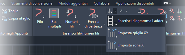 Dopo avere definito il formato del sistema di riferimento, è possibile inserire il diagramma Ladder, la griglia X-Y o le zone X in un disegno. Individuare i comandi nella scheda Schema