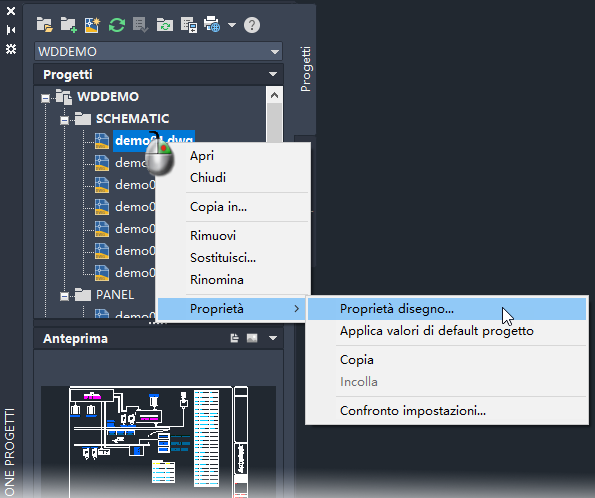 Consente di aggiungere disegni esistenti ad un progetto attivo in qualsiasi momento. Ciò è utile quando si desidera riutilizzare i disegni di un progetto precedente. Per aggiungere o creare i disegni in una cartella specifica, fare clic con il pulsante destro del mouse sul nome della cartella in Gestione progetti e selezionare l'opzione del disegno.