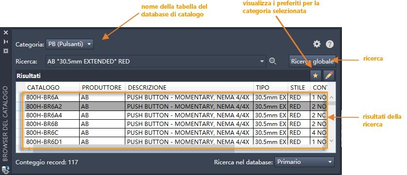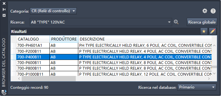 Se si inizia da un elenco di componenti per un progetto e si conoscono già i numeri parte, è possibile inserire un componente selezionandolo dal database di catalogo. Utilizzare la tavolozza del Browser del catalogo per inserire i componenti dal database di catalogo. Trova