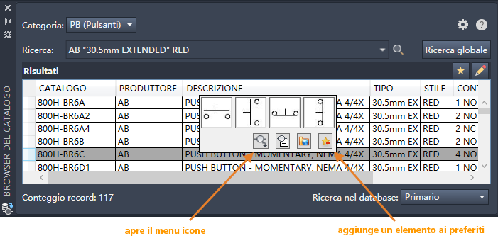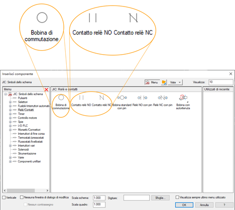 Il menu icone consente di inserire un simbolo selezionando il tipo di simbolo, ad esempio un pulsante NO o un selettore a tre posizioni. Dopo avere inserito il simbolo, è possibile aggiungere annotazioni come descrizioni, informazioni di catalogo e così via.
