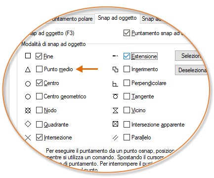 Immettere il comando OSNAP per impostare gli snap ad oggetto di default, definiti anche snap ad oggetto "attivi". Ad esempio, può risultare utile attivare lo snap ad oggetto Punto medio per default.