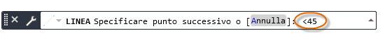 Se è necessario disegnare una linea in corrispondenza di un angolo specificato, è possibile bloccare l'angolo per il punto successivo. Ad esempio, se si desidera creare il secondo punto di una linea in base ad un angolo di 45 gradi, immettere <45 nella finestra dei comandi.