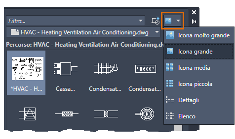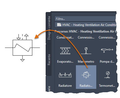 - La scheda Recente visualizza le definizioni di blocco che sono state inserite o create di recente nelle sessioni correnti e precedenti. Questi blocchi possono provenire da diversi disegni.