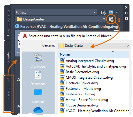 - Per scegliere dalla cartella di DesignCenter un disegno della libreria diverso, verificare che la scheda Libreria sia quella corrente (1) e fare clic sul pulsante di navigazione dei file (2).