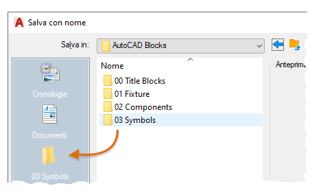 - Creare un singolo file di disegno per ogni blocco che si intende utilizzare. Salvare questi file di disegno nelle cartelle che contengono famiglie di file di disegno correlati.