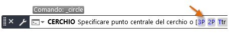 In alternativa, è possibile immettere CERCHIO o solo C nella finestra dei comandi e fare clic per scegliere un'opzione. In tal caso, è possibile specificare un punto centrale oppure fare clic su una delle opzioni di comando evidenziate, come illustrato di seguito.