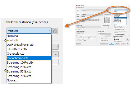 Nella tabella stili di stampa vengono fornite informazioni sull'elaborazione dei colori. I colori visualizzati correttamente sul monitor possono non essere adatti ad un file PDF o alla stampa. Ad esempio, può essere necessario creare un disegno a colori, ma generare un output monocromatico. Di seguito è riportata la procedura per specificare un output monocromatico: