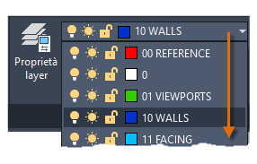 Come si può vedere nella figura, il layer 10 WALLS è il layer corrente. Tutti i nuovi oggetti vengono inseriti automaticamente su tale layer. Nell'elenco, il segno di spunta verde accanto al layer 10 WALLS indica che questo è il layer corrente.