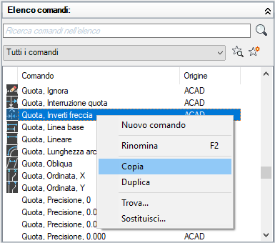 L'elenco viene filtrato in modo da visualizzare solo i comandi definiti dall'utente che sono stati aggiunti ai file di personalizzazione caricati.