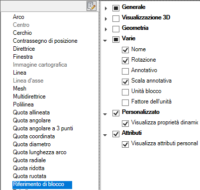 Controllo della visualizzazione di attributi e proprietà personalizzate per i riferimenti di blocco