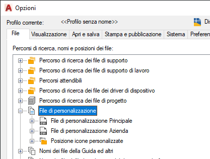 Nella scheda File della finestra di dialogo Opzioni, fare clic sul segno più (+) accanto al nodo File di personalizzazione per espanderlo.