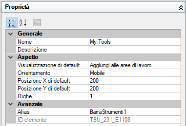 - Selezionare la nuova barra degli strumenti e aggiornarne le proprietà nel riquadro Proprietà: