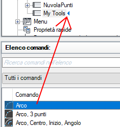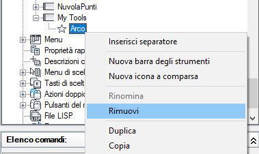 - Nel riquadro Elenco comandi, trascinare il comando da aggiungere alla barra degli strumenti nel riquadro Personalizzazioni in <nome file>.