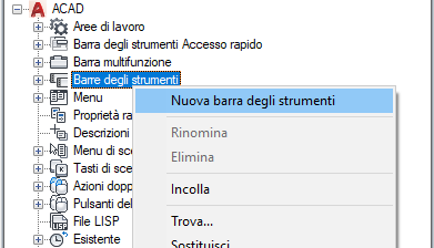 - Trascinare il menu da cui si desidera creare una barra degli strumenti e rilasciarlo sul nodo Barre degli strumenti.