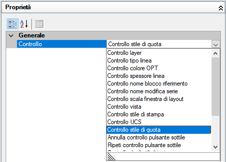 - Nella casella Controllo del riquadro Proprietà, fare clic sulla freccia rivolta verso il basso per visualizzare un elenco di tutti i controlli della barra degli strumenti disponibili.
