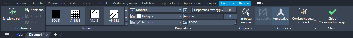 Nota: La scheda Creazione tratteggio della barra multifunzione viene visualizzata non appena si avvia il comando. Questa scheda della barra multifunzione contiene tutto ciò che è necessario durante l'applicazione o la modifica di un tratteggio. Se la barra multifunzione è disattivata, è possibile riattivarla utilizzando il comando BARRAMULTIF.