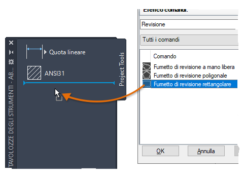 Nell'elenco Comandi, trascinare il comando Fumetto di revisione rettangolare sulla tavolozza degli strumenti.