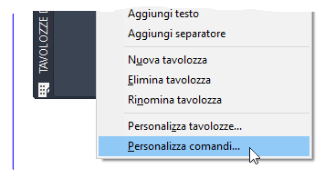 Nota: È possibile creare comandi personalizzati mediante l'editor Personalizza interfaccia utente (CUI) e aggiungerli ad una tavolozza degli strumenti o anche nella barra multifunzione.