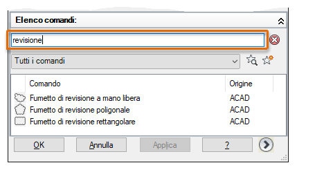 Personalizza interfaccia utente (CUI), nel riquadro Elenco comandi, fare clic sulla casella di testo Ricerca comandi nell'elenco e digitare revision.