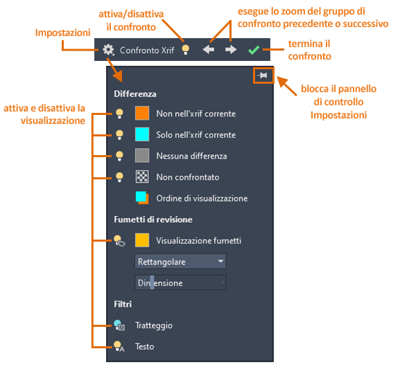 Analogamente alla funzionalità di confronto dei disegni, è ora possibile confrontare le modifiche apportate ad un file di disegno associato come riferimento esterno (xrif) nel disegno corrente.