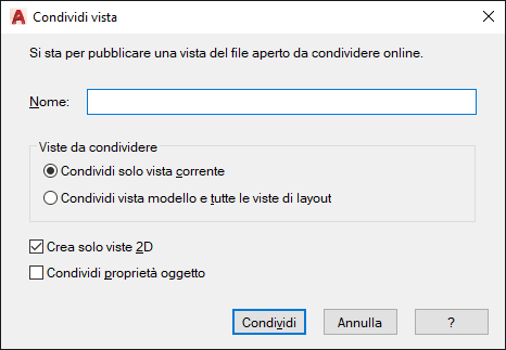 Assegna un nome alla vista condivisa. Il nome può avere una lunghezza massima di 255 caratteri e contenere lettere, numeri, spazi e qualsiasi carattere speciale non utilizzato dal sistema operativo e da questo programma per altri scopi.
