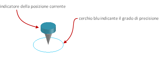 L'indicatore della posizione corrente consente di tenere traccia della posizione utilizzando le funzionalità di rilevamento della posizione integrate nel sistema operativo in uso. Il cerchio blu attorno all'indicatore segnala il livello di affidabilità con cui viene determinata la posizione. Minore è la dimensione del cerchio, maggiore è la precisione.