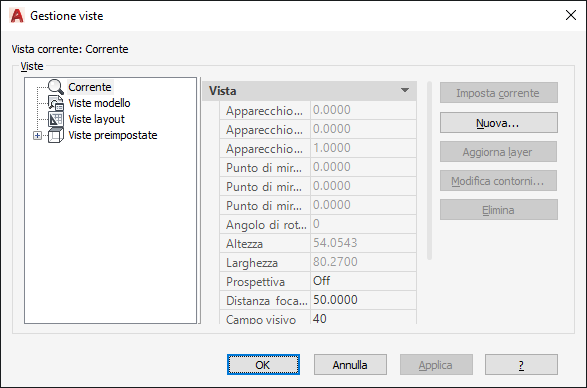 Visualizza il nome di una vista modello, layout o apparecchio fotografico selezionata.