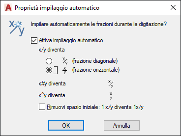 TESTOM (comando) Trova: selezionare una frazione impilata nell'editor di modifica diretta del testo > > Proprietà impilaggio > Impilaggio automatico