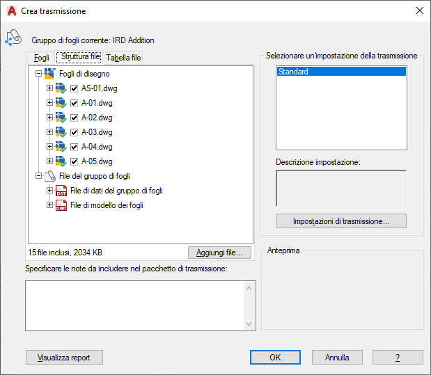 Per default, vengono elencati tutti i file associati al disegno corrente (quali rimandi, stili di stampa e font correlati). È possibile aggiungere altri file al pacchetto di trasmissione o rimuovere quelli esistenti. I file correlati a cui viene fatto riferimento tramite URL non vengono inclusi nel pacchetto di trasmissione.