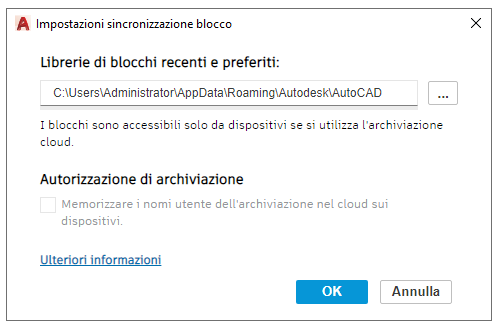 Il pulsante Impostazioni di sincronizzazione dei blocchi nella parte inferiore della tavolozza Blocchi è dinamico e indica se i blocchi recenti e preferiti vengono sincronizzati in un'archiviazione cloud.