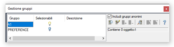 Se un gruppo non è selezionabile, la lampadina apparirà disattivata e sarà possibile selezionare solo i singoli membri del gruppo. Se la variabile di sistema PICKSTYLE è impostata su 0, nessun gruppo risulterà selezionabile.