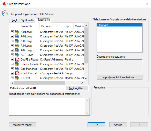 Per default, vengono elencati tutti i file associati al disegno corrente (quali rimandi, stili di stampa e font correlati). È possibile aggiungere altri file al pacchetto di trasmissione o rimuovere quelli esistenti. I file correlati a cui viene fatto riferimento tramite URL non vengono inclusi nel pacchetto di trasmissione.
