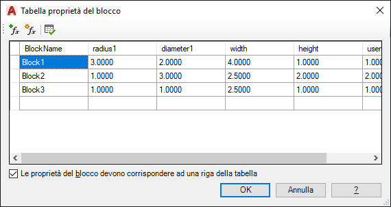 Finestra di dialogo Tabella proprietà del blocco