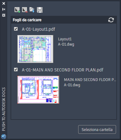 Apre la tavolozza Push to Autodesk Docs, dove è possibile selezionare i layout di AutoCAD da caricare come file PDF in Autodesk Docs.