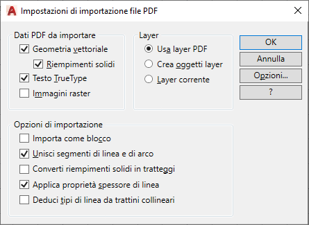 Imposta le opzioni per l'importazione di geometria, riempimenti, immagini raster e oggetti di testo TrueType da un file PDF specificato.