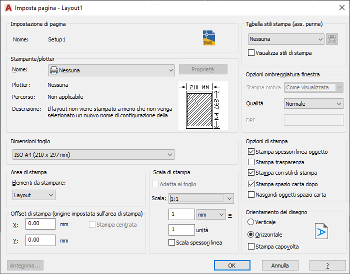 Le impostazioni di impostazione pagina specificate dall'utente vengono memorizzate con il layout e possono essere applicate ad altri layout o importate in altri disegni.