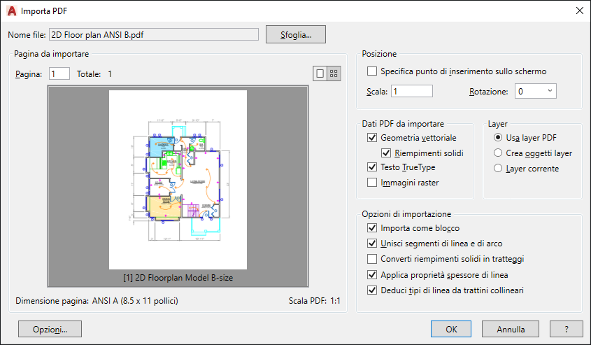 Crea i layer di AutoCAD per ciascuno dei seguenti tipi generali di oggetti importati dal file PDF: PDF_Geometria, PDF_Riempimenti solidi, PDF_Immagini e PDF_Testo.