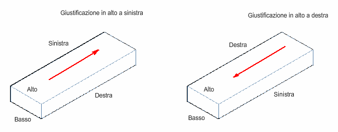 Nell'esempio seguente la giustificazione In alto a sinistra viene confrontata con la giustificazione In alto a destra di un oggetto canale aria. La direzione di disegno, indicata dalle frecce, determina la modalità di rappresentazione della giustificazione nel disegno.