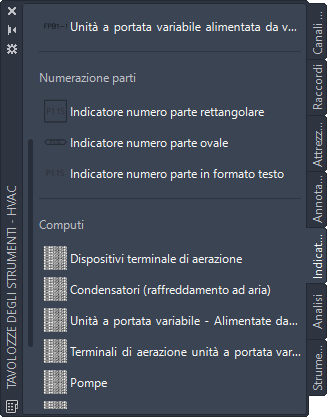 Gli strumenti per i numeri parte consentono di numerare gli indicatori singolarmente o in sequenza e di utilizzare lo stesso numero per parti dello stesso tipo. Per gli indicatori del numero di parte è possibile utilizzare numeri o etichette di testo. Mentre gli indicatori del numero di parte funzionano con tutti gli oggetti MEP, gli strumenti disponibili nella tavolozza Indicatori e computi possono essere utilizzati esclusivamente con i sistemi di canali aria e tubature. Per ulteriori informazioni, vedere Utilizzo di indicatori del numero di parte e computi.