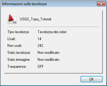 Informazioni. La finestra di dialogo Informazioni sulla tavolozza mostra che soltanto 90 colori su 256 sono utilizzati per questa immagine e la trasparenza sfondo non è attivata. Fare clic su OK.