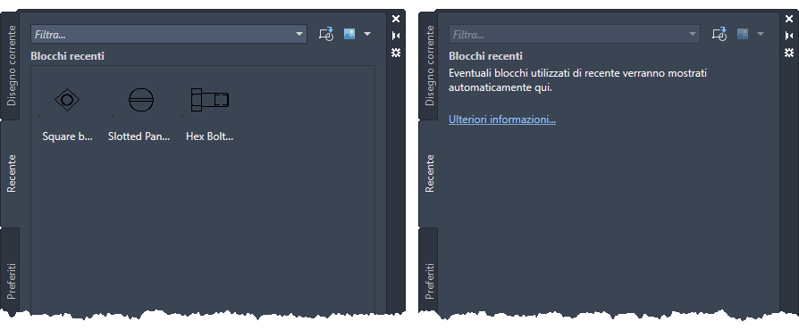 La scheda Recenti della tavolozza Blocchi visualizza le istantanee dei blocchi inseriti o creati di recente nel disegno corrente. È possibile sincronizzare i blocchi recenti di un disegno in una posizione di memorizzazione nel cloud e accedervi da qualsiasi dispositivo utilizzando il desktop di AutoCAD o l'