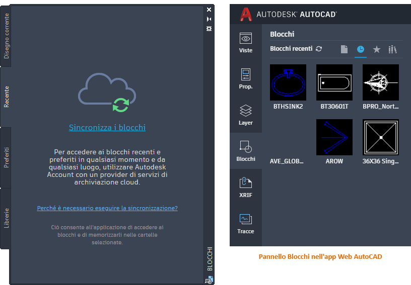 L'opzione Sincronizza i blocchi potrebbe non essere visualizzata nella tavolozza Blocchi se nel disegno corrente sono già presenti blocchi recenti o se non è stata utilizzata la tavolozza Blocchi per accedere ad Autodesk Account.