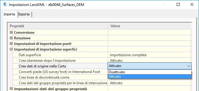 Figura 2: Impostazioni LandXML per l'importazione delle superfici