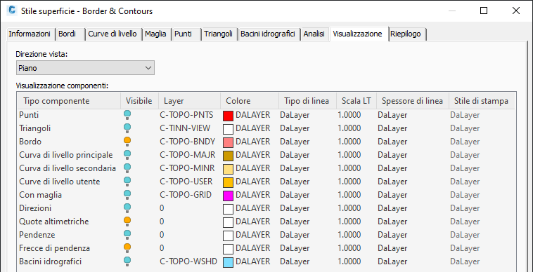Aprire il file degli stili di esempio, Sample_styles.dwg, in C:\Programmi\AutoCAD 2022\C3D\Help\Civil Best Practices Guide. Gli stili di superficie sono stati progettati per visualizzare i diversi componenti di una superficie nelle varie fasi della progettazione. Lo stile di superficie assegnato alla Carta è denominato Existing Ground Contours e rappresenta un esempio di stile in genere utilizzato durante la fase di ideazione di un progetto.
