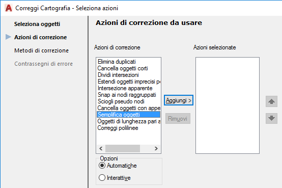 In Autodesk Civil 3D è inclusa anche un'utilità avanzata sviluppata per AutoCAD Map 3D che consente di eliminare gli oggetti duplicati, sfoltire le polilinee ed eseguire molte altre azioni di correzione. Per controllare le singole azioni è possibile impostare diversi parametri. Accedere agli strumenti di correzione in uno dei due modi seguenti: